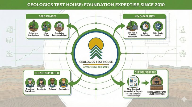GEOLOGICS TEST HOUSE is a geotechnical investigation and soil testing firm established in 2010. We carry out subsurface investigations, field testing and provide foundation recommendations for a wide range of civil engineering projects. For over 15 years, we have worked closely with structural consultants, architects, builders and contractors, helping them understand ground conditions and design safe, economical foundations using dependable soil and rock data. Our approach combines practical site experience with in-house laboratory testing and engineering interpretation. With our own drilling rigs and testing facilities, we can mobilize quickly to site and maintain full control over the quality of investigation and reporting.